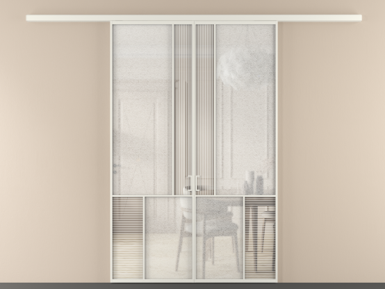 Дополнительно на раздвижную двустворчатую перегородку вдоль стены и четырехстворчатую перегородку внутри проема с двумя неподвижным полотнами можно установить механизм синхронного открывания — при открывании одной створки, вторая открывается автоматически.